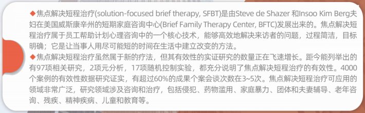 焦点解决短程咨询(Solution-Focused Brief Therapy),作为后现代主义理念下逐步发展成熟的心理学流派,其特点是积极正向,面向未来,聚焦目标,一小步改变,成为后现代主义心理学流派的代表理论之一。因为其资源取向、聚焦目标、简单实用、优良快速的特点,焦点解决的核心思想和技术被广泛应用于组织、企业、政府,以及教育、医院、学校、社区服务等领域。