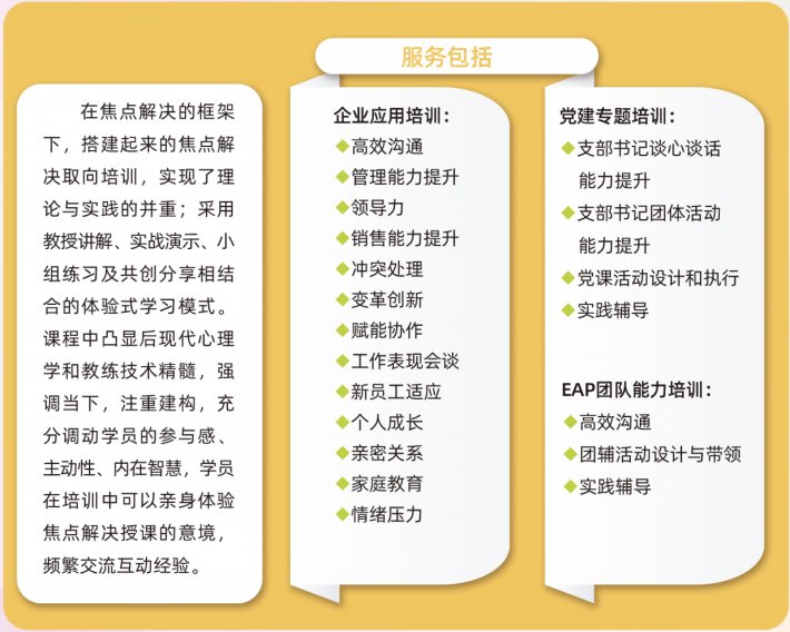 福可思致力于焦点解决转化、应用、研究、推广,可以提供的内容如下: