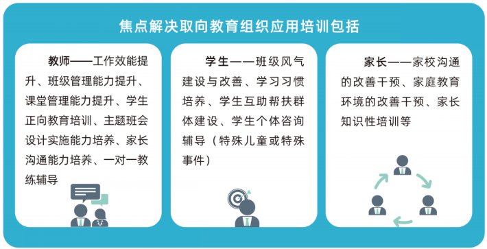 二、焦点解决取向教育组织应用服务福可思项目团队在教育教学领域,为广大学校和教育单位提供焦点解决的教学培训、应用服务,致力于帮助客户实现教职员工效能和幸福感的提升、实现学生群体的快乐健康学习成长、实现家校协同的效率合作。自2017年成立以来,已服务过20+所学校及教育单位,获得多家国内知名的中小学、高校、教育主管单位及教育服务机构的一致好评。